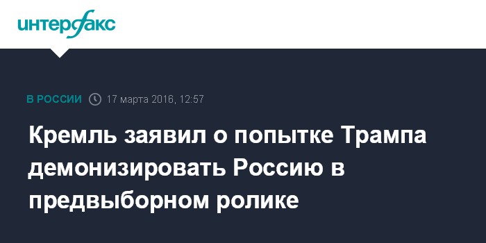 Москва. 17 марта. INTERFAX.RU - Рекламный ролик предвыборной кампании Дональда Трампа, где фигурирует изображение российского президента на фоне некоего террориста, является попыткой демонизации России в рамках предвыборной гонки в США, заявил пресс-секретарь президента РФ Дмитрий Песков.
