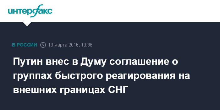 Москва. 18 марта. INTERFAX.RU - Президент РФ Владимир Путин внес в Госдуму на ратификацию Соглашение о порядке формирования и применения совместных групп для быстрого реагирования на угрозы пограничной безопасности на внешних границах СНГ, сообщает в пятницу сайт Кремля.