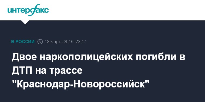 Москва. 18 марта. INTERFAX.RU - Автомобиль с сотрудниками Федеральной службы по контролю за оборотом наркотиков (ФСКН) попал в аварию на федеральной трассе А-146 "Краснодар-Новороссийск", два человека погибли, сообщили "Интерфаксу" оперативных службах региона.