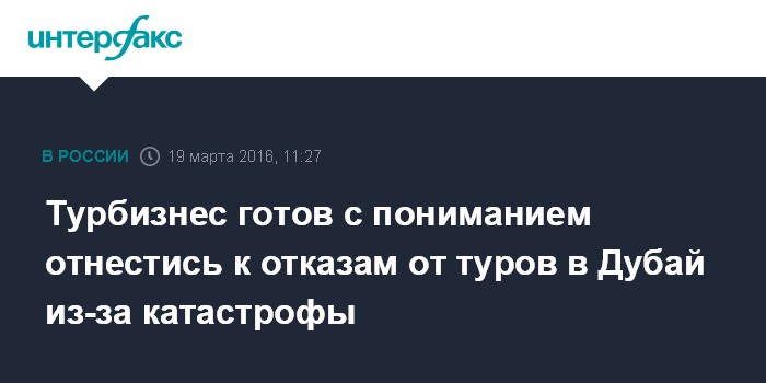 Москва. 19 марта. INTERFAX.RU - Туроператоры и турагентства готовы с пониманием отнестись к отказам от туров в Дубай в ближайшие дни после авиакатастрофы в Ростове-на-Дону, сообщила порталу "Интерфакс-Туризм" в субботу пресс-секретарь Российского союза туриндустрии (РСТ) Ирина Тюрина.