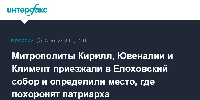 Москва. 6 декабря. INTERFAX.RU - Члены Священного Синода митрополит Крутицкий и Коломенский Ювеналий, митрополит Смоленский и Калининградский Кирилл и митрополит Боровский и Калужский Климент приезжали в субботу в Богоявленский кафедральный Елоховский собор, чтобы окончательно определиться с местом, где будет покоиться тело патриарха Московского и всея Руси Алексия II.