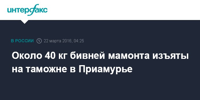 Москва. 22 марта. INTERFAX.RU - Гражданин России пытался незаконно вывезти в Китай через пункт пропуска Благовещенск - Хэйхэ в Амурской области фрагменты бивней мамонта.