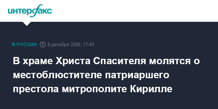 Москва. 6 декабря. INTERFAX.RU - На всенощном бдении в субботу в храме Христа Спасителя впервые была провозглашена молитва о новоизбранном местоблюстителе патриаршего престола. "Еще молимся о местоблюстителе патриаршего престола, высокопреосвященнейшем митрополите Кирилле", - провозгласил диакон во время богослужения.