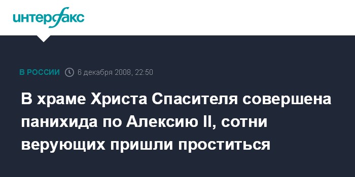 Москва. 6 декабря. ИНТЕРФАКС - В Москве, в храме Христа Спасителя после завершения вечернего богослужения была отслужена панихида по умершему патриарху Московскому и всея Руси Алексию II.