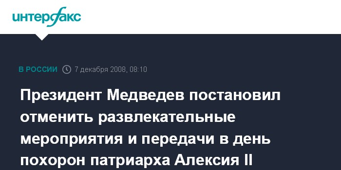 Президент Медведев постановил отменить развлекательные мероприятия и передачи в день похорон патриарха Алексия II
