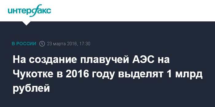 Москва. 23 марта. INTERFAX.RU - Правительство направит из федерального бюджета 1 млрд рублей на проект строительству и вводу в эксплуатацию плавучей атомной теплоэлектростанции в 2016 году на Чукотке, сообщили в среду в пресс-службе аппарата губернатора и правительства региона.