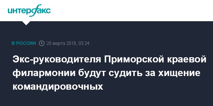 Москва. 25 марта. INTERFAX.RU - Бывшего руководителя Приморской краевой филармонии будут судить по обвинению в присвоении денег, выделенных на командировочные расходы.