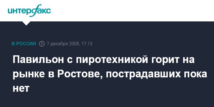 "Сигнал о пожаре на одном из рынков на выезде из Ростова-на-Дону поступил в 15:51 мск в воскресенье на пульт единой диспетчерской службы. В результате пожара произошло возгорание торговой палатки с новогодней пиротехникой, которая стала разлетаться по территории рынка", - уточнил представитель пресс-службы.