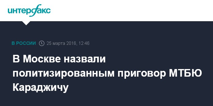 Москва. 25 марта. INTERFAX.RU - В Москве считают политизированным решение Международного трибунала по бывшей Югославии приговорить к 40 годам тюремного заключения лидера боснийских сербов Радована Караджича.