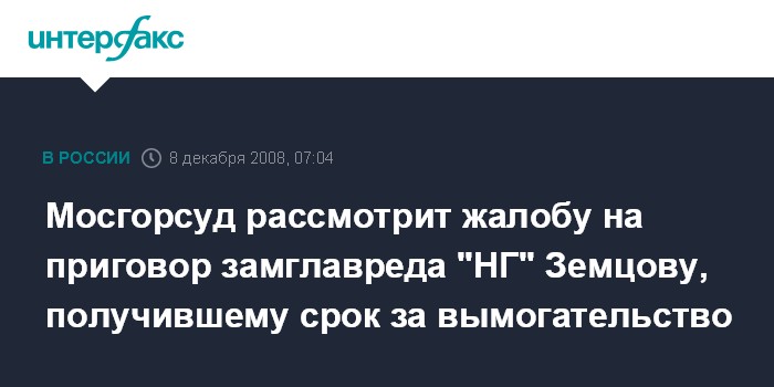 Москва. 8 декабря. ИНТЕРФАКС - Мосгорсуд вернется к рассмотрению жалобы защиты на приговор заместителю главного редактора "Независимой газеты" Борису Земцову, осужденному на 8 лет заключения за вымогательство.