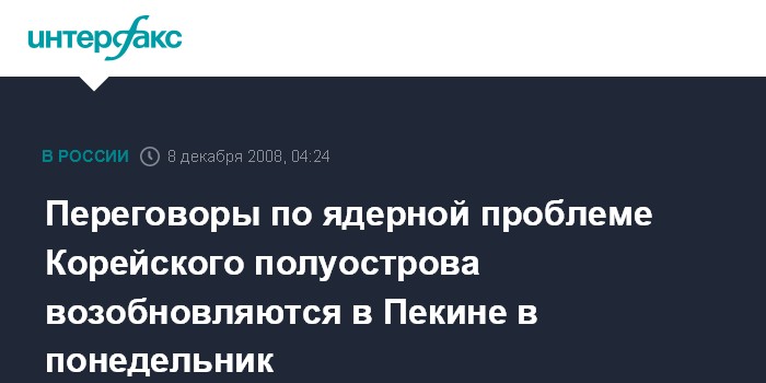 Пекин. 8 декабря. ИНТЕРФАКС-КИТАЙ - Переговоры по северокорейской ядерной проблеме возобновятся в Пекине в понедельник, сообщил агентству "Интерфакс-Китай" информированный китайский источник.