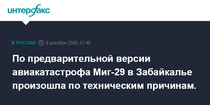 Чита. 8 декабря. ИНТЕРФАКС-СИБИРЬ - Катастрофа истребителя МиГ-29 в Забайкальском крае, в результате которой погиб летчик, предварительно, произошла по техническим причинам.