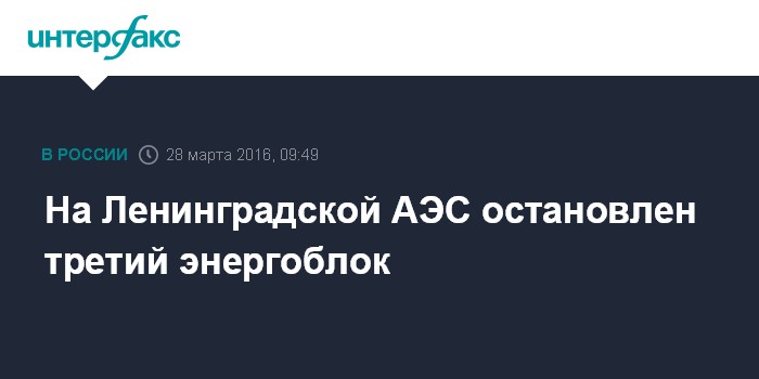Москва. 28 марта. INTERFAX.RU - Дефект высоковольтной линии электропередачи привел к вынужденной остановке третьего энергоблока Ленинградской атомной электростанции (ЛАЭС).