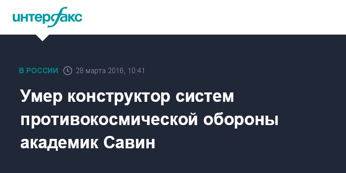 "Савин был одним из корифеев отечественного оборонно-промышленного комплекса, разработчиком системы противокосмической обороны страны, космического эшелона системы раннего обнаружения ракетных стартов, а также системы морской космической разведки и целеуказания Военно-морского флота", - говорится в сообщении, поступившем в "Интерфакс" в понедельник.