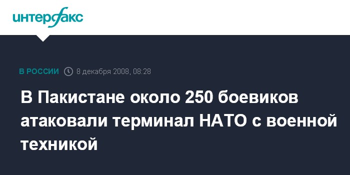 Москва. 8 декабря. INTERFAX.RU - Близ города Пешавар на северо-западе Пакистана совершено нападение на грузовой терминал НАТО, где находилась военная техника, предназначенная для отправки в Афганистан, сообщила британская телерадиокорпорация BBC.