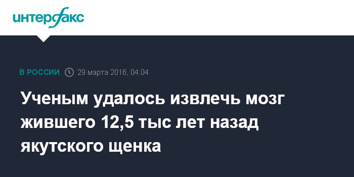 Москва. 29 марта. INTERFAX.RU - В Якутии учеными извлечен хорошо сохранившийся мозг щенка "туматской собаки", найденной сотрудниками Музея мамонта Северо-Восточного федерального университета (СВФУ), который жил 12,5 тыс. лет назад.