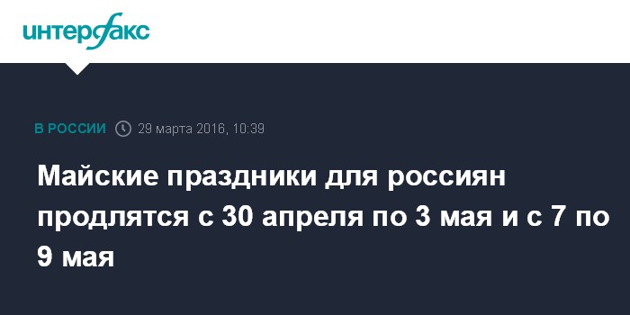 Москва. 29 марта. INTERFAX.RU - В этом году связи с празднованием Первомая у россиян будет четыре выходных дня подряд - с 30 апреля по 3 мая включительно, а к празднованию Дня Победы, включая сам праздничный день, у них будет три нерабочих дня, с 7 по 9 мая, напомнили в Роструде.