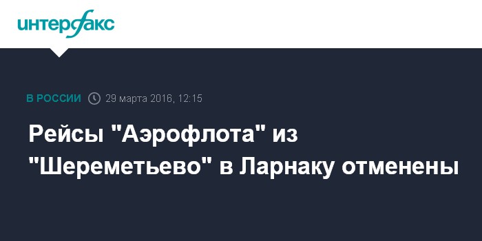 Москва. 29 марта. INTERFAX.RU - Запланированные на вторник рейсы "Аэрофлота" из московского аэропорта "Шереметьево" в аэропорт Ларнаки на Кипре отменены, сообщил аэропорт.