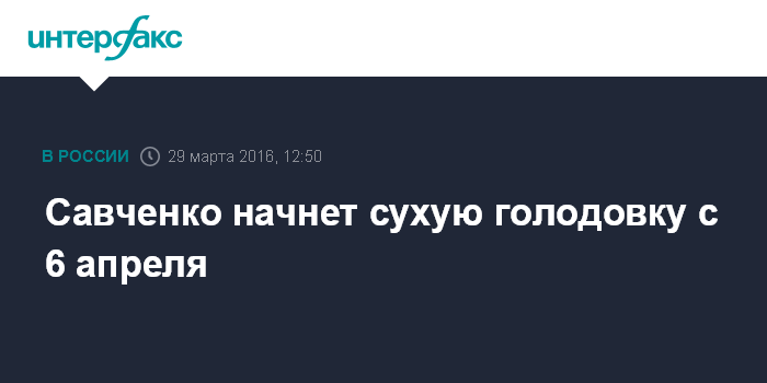 В заявлении, которое адвокат выложил во вторник в твиттере, говорится, что Савченко начнет сухую голодовку 6 апреля и будет продолжать ее до переломного момента. Также украинская летчица заявила, что выйдет из СИЗО только для того, чтобы отправиться на Украину, а не в колонию.