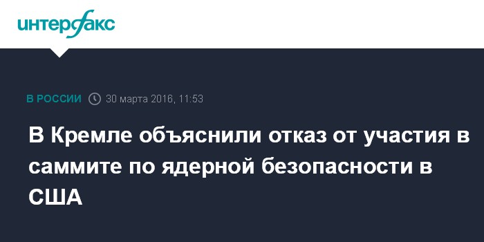 "В Москве считают, что проработка вопросов, связанных с ядерной безопасностью, требует общих и совместных усилий и взаимного учета интересов и позиций. Определенный дефицит взаимодействия в ходе предварительной проработки вопросов и тематики саммита мы испытывали. Поэтому в данном случае и не происходит участие российской стороны (в саммите - ИФ)", - сказал журналистам в среду пресс-секретарь президента РФ Дмитрий Песков, отвечая на вопрос, почему РФ не представлена на этой встрече на высоком уровне.