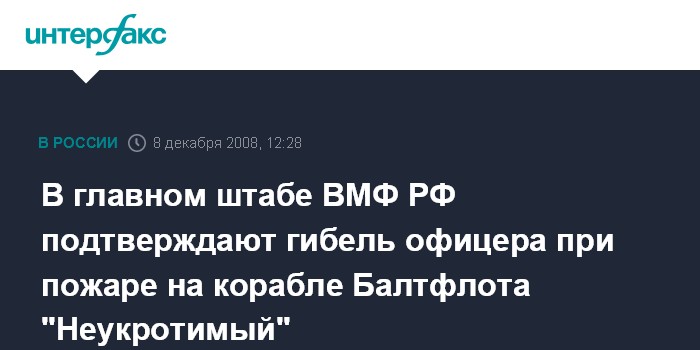 Москва. 8 декабря. INTERFAX.RU - В командовании ВМФ России официально подтвердили гибель при пожаре офицера экипажа сторожевого корабля Балтфлота "Неукротимый".