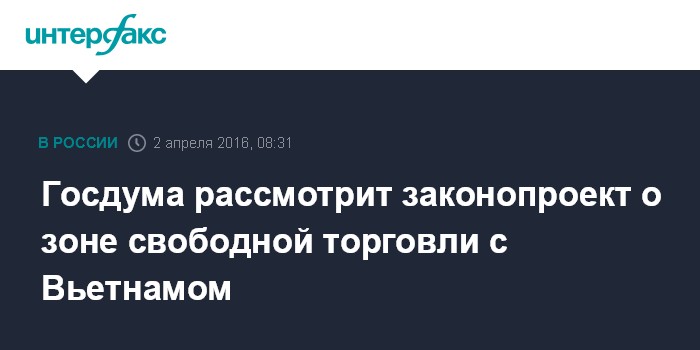 Москва. 2 апреля. INTERFAX.RU - Правительство внесло в Госдуму законопроект о ратификации соглашения о зоне свободной торговли между Евразийским экономическим союзом и Вьетнамом. Соответствующее постановление опубликовано на сайте кабмина.