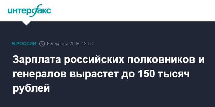 "К 2012 г. в среднем денежное довольствие младших офицеров составит 69,4 тыс. рублей, а денежное довольствие старших офицеров - от полковника и выше - 120-150 тыс. рублей", - сказал В.Заварзин в понедельник на встрече с военными атташе, аккредитованными в Москве.