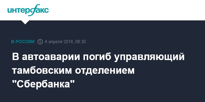 Москва. 4 апреля. INTERFAX.RU - Управляющий тамбовским отделением ОАО "Сбербанк России" Владимир Ларин погиб в ДТП на 83 км трассы "Воронеж-Тамбов", сообщил в воскресенье "Интерфаксу" источник в правоохранительных органах региона.