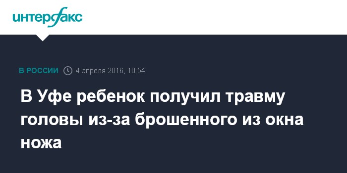 Москва. 4 апреля. INTERFAX.RU - Трехлетний мальчик в Уфе получил травму головы в результате падения на него ножа из окна жилого дома, сообщили "Интерфаксу" в пресс-службе МВД по Башкирии в понедельник.