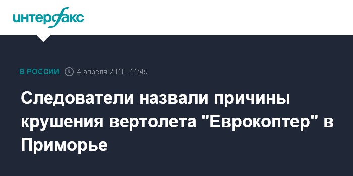 Москва. 4 апреля. INTERFAX.RU - Следователи обнародовали версии крушения малого вертолета "Еврокоптер", который разбился 2 апреля недалеко от поселка Тавричанка в Приморье.