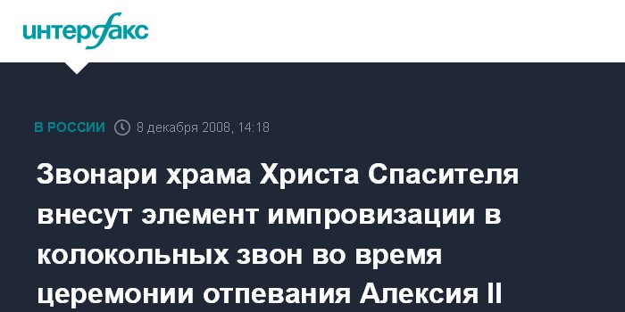 "Мы решили внести элемент своего рода импровизации, поминального звонарского творчества в колокольный звон (во время отпевания патриарха в храме Христа Спасителя - "ИФ"), который, однако, укладывается в традиции Русской православной церкви", - заявил корреспонденту портала "Интерфакс-Религия" (www.interfax-religion.ru) в понедельник художественный руководитель колокольных звонов Московского Кремля и храма Христа Спасителя Игорь Коновалов.
