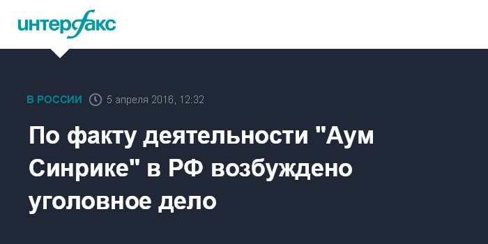 Москва. 5 апреля. INTERFAX.RU - В России возбуждено уголовное дело по факту деятельности в Москве и Петербурге запрещенной в стране секты "Аум Синрикё", сообщил "Интерфаксу" официальный представитель Следственного комитета России Владимир Маркин.