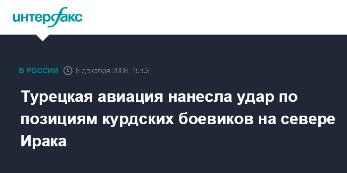 Москва. 8 декабря. INTERFAX.RU - Самолеты военно-воздушных сил Турции в понедельник нанесли бомбовые удары по позициям боевиков Рабочей партии Курдистана на севере Ирака, сообщает турецкий телеканал Эн-Ти-Ви.