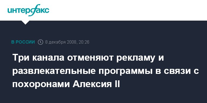 Москва. 8 декабря. INTERFAX.RU - Федеральные телеканалы в связи с похоронами патриарха Московского и всея Руси Алексия II во вторник, 9 декабря, снимут с эфира рекламу, а также развлекательные передачи.