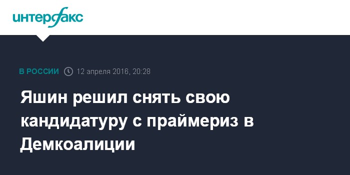 Москва. 12 апреля. INTERFAX.RU - Зампред партии ПАРНАС Илья Яшин снимает свою кандидатуру с праймериз Демократической коалиции и не намерен в них участвовать, пока Михаил Касьянов имеет квоту на первое место в списке.