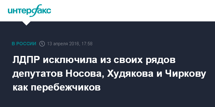 "Носова исключили с формулировкой "за утрату связи с партией", Худякова и Чиркову - с формулировкой "за совершение действий, порочащих репутацию члена ЛДПР и наносящих моральный ущерб партии", - говорится в поступившем в среду в "Интерфакс" сообщении.