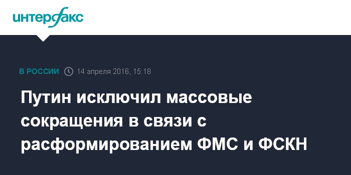 Москва. 14 апреля. INTERFAX.RU - Масштабных сокращений в связи с расформированием Федеральной миграционной службы (ФМС) и Федеральной службы по контролю за оборотом наркотиков (ФСКН), в частности, оперативного состава не будет, заявил президент РФ Владимир Путин в ходе прямой линии с гражданами.
