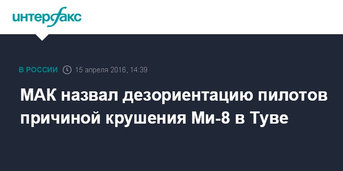 Москва. 15 апреля. INTERFAX.RU - Причиной катастрофы вертолета Ми-8 в Туве в ноябре 2014 года стала потеря экипажем визуальной ориентации в условиях полета на высоте ниже безопасной, сообщает Межгосударственный авиационный комитет (МАК).