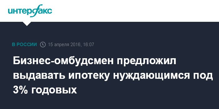 Бизнес-омбудсмен предложил выдавать ипотеку нуждающимся под 3% годовых