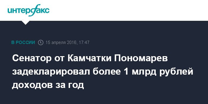 В прошлом году сенатор от Камчатки Пономарев задекларировал доход за 2014 год в сумме 362,6 млн рублей.