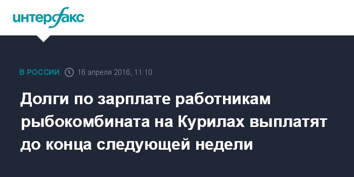 Москва. 16 апреля. INTERFAX.RU - ЗАО "Рыбокомбинат Островной" полностью погасил в субботу свои долги по зарплате 35 работникам предприятия, сообщает пресс-служба правительства Сахалинской области.