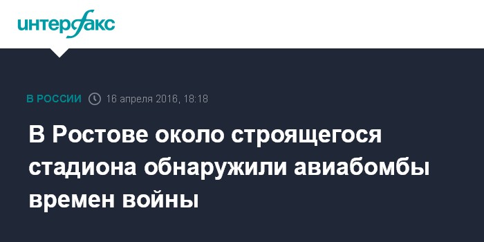 Москва. 16 апреля. INTERFAX.RU - Две авиабомбы времен Великой Отечественной войны обнаружены в ходе проведения дорожно-ремонтных работ близ строящегося стадиона на левом берегу реки Дон, сообщили "Интерфаксу" в экстренных службах региона.
