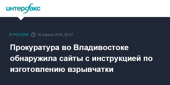 Москва. 18 апреля. INTERFAX.RU - Прокуратура во Владивостоке добивается закрытия 14-ти интернет-сайтов с инструкциями по изготовлению взрывчатки.