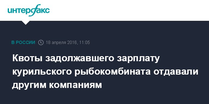 Москва. 18 апреля. INTERFAX.RU - Долги по зарплате, на которые работники курильского рыбокомбината "Островной" пожаловались во время "прямой линии" с президентом РФ Владимиром Путиным, были связаны с передачей квот компании другим предприятиям, сообщает пресс-служба правительства Сахалинской области.