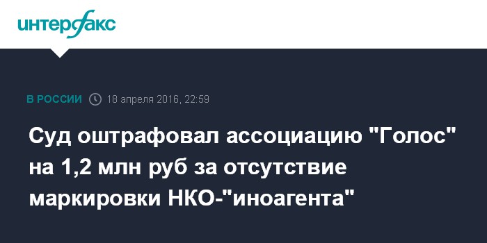 Москва. 18 апреля. INTERFAX.RU - Пресненский суд Москвы оштрафовал ассоциацию "Голос" на 1,2 млн рублей за отсутствие маркировки НКО-"иноагента" в материалах, сообщил сопредседатель движения Григорий Мельконьянц.