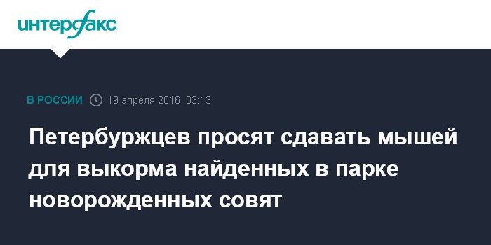 Москва. 19 апреля. INTERFAX.RU - Петербургский центр помощи птицам и диким животным "Сирин" объявил сбор мышей на корм трем новорожденным совятам, найденным в парке на юге города.