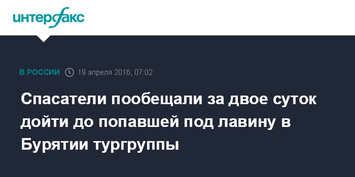 Москва. 19 апреля. INTERFAX.RU - Группа спасателей планирует прибыть к месту схода лавины, под которой в Бурятии погибли два туриста из Иркутска, не раньше среды, сообщили агентству "Интерфакс" в пресс-службе ГУ МЧС.