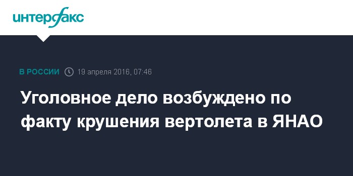 Москва. 19 апреля. INTERFAX.RU - Следственные органы в Ямало-Ненецком автономном округе возбудили уголовное дело после крушения вертолета марки Robinson R-66, повлекшего гибель трех человек, сообщает пресс-служба Уральского следственного управления на транспорте СК РФ во вторник.