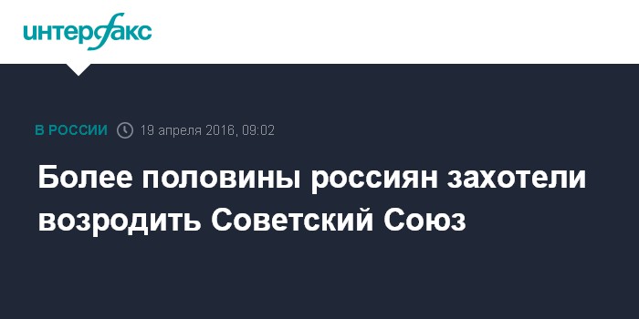 Москва. 19 апреля. INTERFAX.RU - Более половины россиян считают, что распада Советского Союза можно было избежать (51%) и сожалеют о том, что это произошло (56%), сообщили "Интерфаксу" в "Левада-Центре".