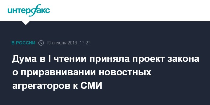 Москва. 19 апреля. INTERFAX.RU - Госдума во вторник приняла в первом чтении законопроект, предлагающий приравнять к СМИ крупные новостные агрегаторы.